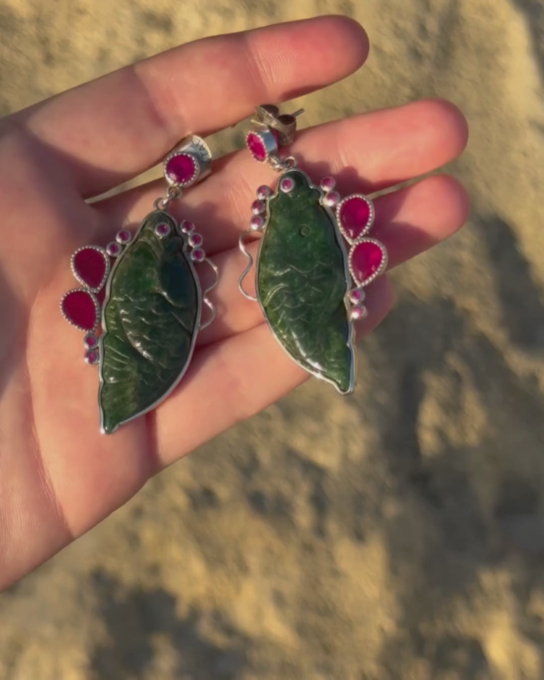 - Imperial Jade Earrings in 925 mm Sterling Silver with natural Rubies.
